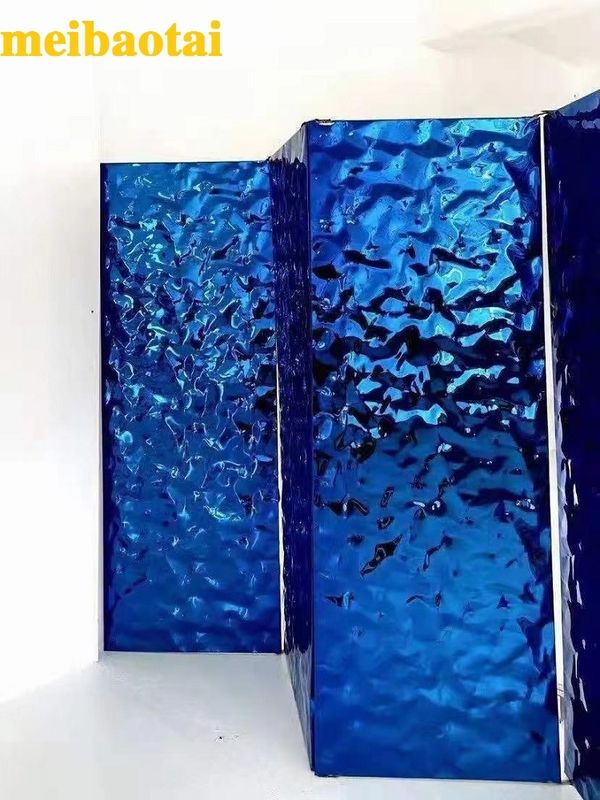 A superfície da folha ondulada do metal ordinário é plana, e a imagem refratada é igualmente uniforme e uniforme. Mas se a placa de metal é batida com um martelo, a superfície tornar-se-á desigual, e a imagem refratada pode apresentar um efeito tridimensional visual. Com os métodos diferentes da percussão, a folha da ondinha da água do metal pode ser dividida em três categorias: grandes ondinhas da água, ondinhas pequenas da água, e testes padrões da escala da água. Os métodos de tratamento da superfície da ondinha da água incluem brilhante, escovado, ouro, ouro cor-de-rosa, titânio preto, ouro do champanhe, e azul da safira.